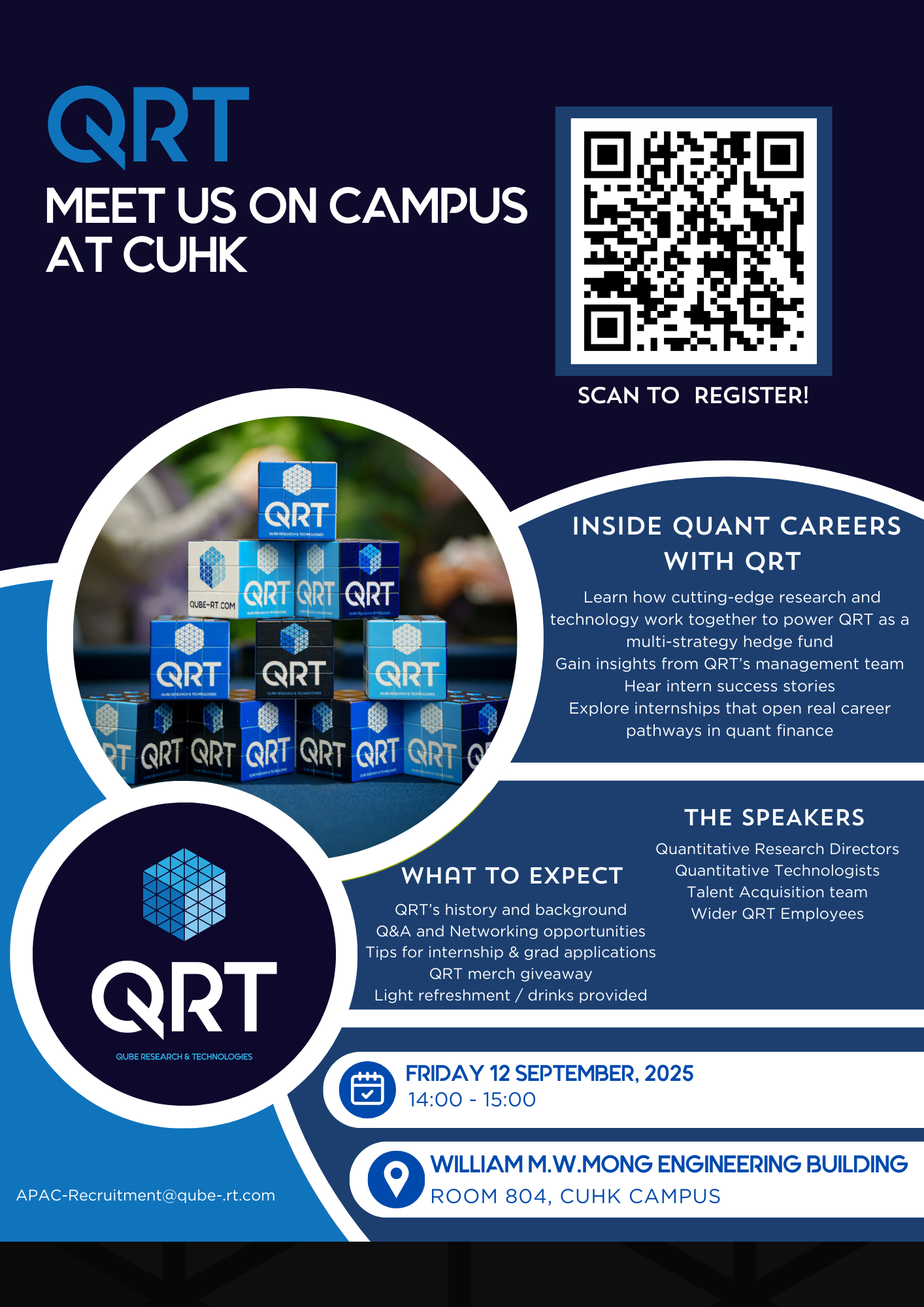 Step inside the world of QRT and discover how innovation, technology, and research come together to drive success. Hear directly from our management team, network with QRT's employees, and learn about the wide range of trading strategies and technologies powering our business. Alumni will share their success stories of how they turned internships into full-time roles —proof that your career can start here. Explore impactful internship opportunities, gain mentorship from world-class experts, and see how you can shape the future of quantitative finance. And last but not least, you can leave with exclusive QRT merch!